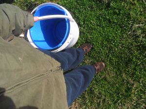 Decked out in my farm gear, which translates to Stephen’s sweat pants and coat, old shoes, and armed with two buckets.
